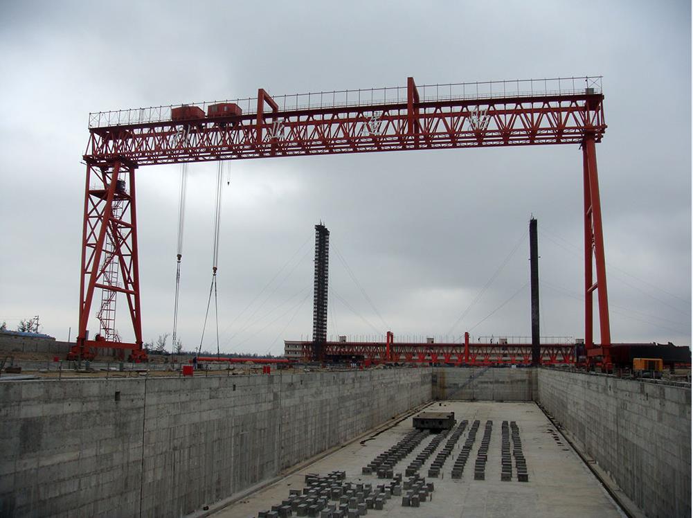 Это оборудование используется в провинции Пиньтан, Фуцзянь, Китай. Главная балка имеет длину 105 метров, что делает его самым большим козловым краном в Китае на сегодняшний день. Две седла в центре конструкции улучшают боковую стабильность конструкции. Ноги оборудования изготовлены из стальных труб, которые одновременно жесткие и гибкие, с укрепленными стальными стержнями, сваренными внутри труб. Поверхность, обращенная к ветру, небольшая, и ноги прочные. Существует множество средств безопасности, включая систему блокировки колес, систему правильного отклонения и систему частотного преобразования контроля.