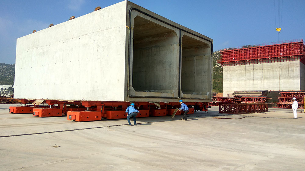 Это оборудование использовалось на проекте Гуандунская электростанция Lufeng Jiahuwan мощностью 2X1000 мВт, в рамках проекта строительства пристани. Оно предназначалось для перемещения 796 тонн дренажных колодцев с предварительно изготовленной площадки в порт для отгрузки. Гидравлический подъем и электромоторы обеспечивают подъем и транспортировку колесной тележки с максимальной грузоподъемностью 1000 тонн. Оборудование включает 18 наборов колесных тележек массой 60 тонн каждая. Вся система и разобранные отдельные тележки обладают функциями вертикального и горизонтального самохода, подъема и поворота.