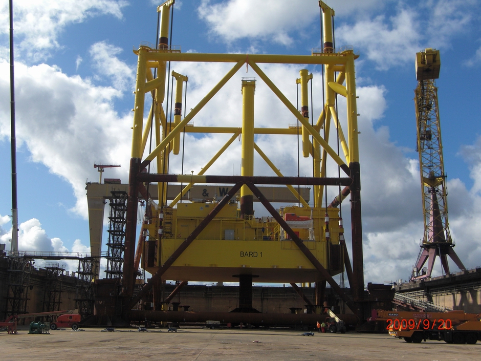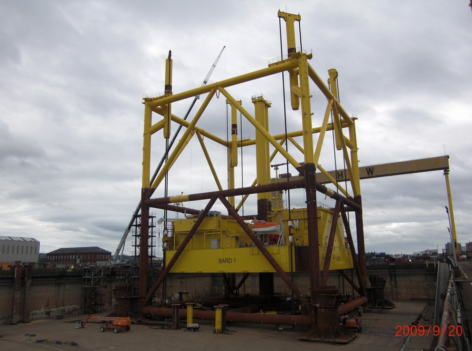 Ветроэлектростанция BARD 1 расположена в Северном море и имеет в общей сложности 80 ветряных турбин мощностью до 400 МВт, которые подключены к немецкой сети сверхвысокого напряжения с помощью подводного кабеля длиной 125 км. Компания DLT поставила и эксплуатировала систему многожильных домкратов 16 x DL-S588 с компьютерным управлением для самостоятельной установки центрального трансформатора и жилой платформы. Система strand jack использовалась для подвешивания 3500-тонного кожуха к плавучей платформе во время морской транспортировки, затем для опускания кожуха на морское дно и, наконец, для подъема 3320-тонной платформы из моря в конечное рабочее положение, где она затем конструктивно соединялась с кожухом.