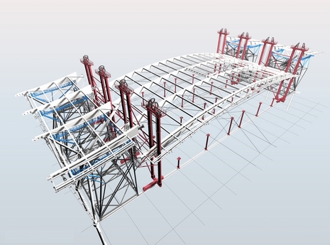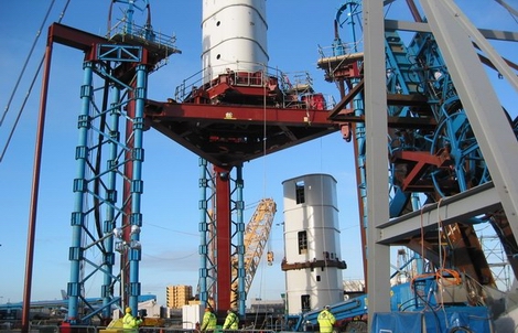 Грузоподъемность каждого подъемника составляет 2000 тонн, и он поднимается с помощью 16 домкратов грузоподъемностью не более 185 тонн. Монтажные рамы для ножек в сборе сконструированы таким образом, чтобы обеспечить полностью регулируемую опору для каждого из компонентов ножки, а также возможность перемещения между монтажными положениями, избегая необходимости демонтажа и повторного монтажа.