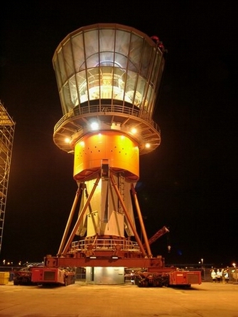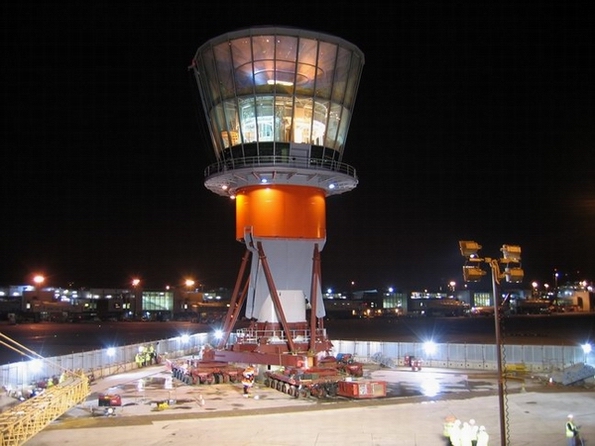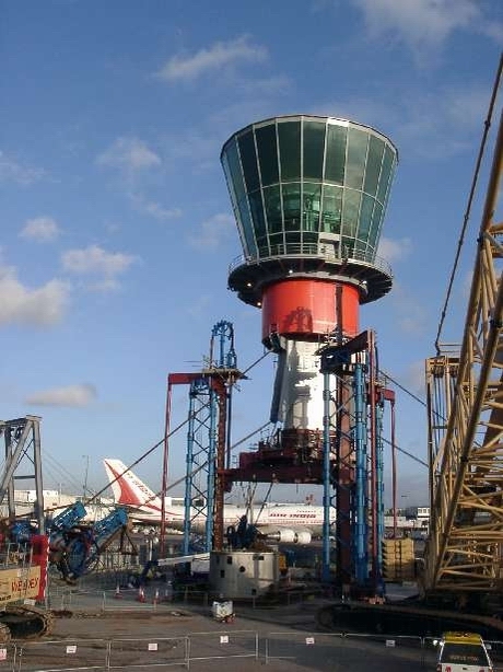 Подъемные домкраты подняли конструкцию кабины примерно на 14 м, что позволило установить секцию стальной мачты ниже. Затем конструкция была опущена, что позволило перезагрузить подъемную систему. Этот цикл подъема повторялся пять раз, пока не была установлена последняя секция мачты. Затем завершенная диспетчерская вышка была опущена на свой постоянный фундамент и установлены постоянные опоры.