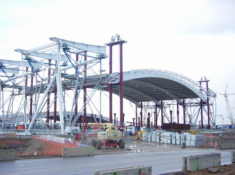 Крыша главного терминала была возведена с использованием методов, более распространенных при строительстве крупных мостов. Главная крыша состоит из серии связанных арочных стальных коробчатых стропил с четким пролетом 156 м, опирающихся на трубчатые опоры в сборе. Сначала монтируются опоры на специально разработанные монтажные рамы DLT, за которыми следуют коробчатые стропила. Стропила собираются на уровне земли, а затем поднимаются на полную высоту группами по четыре с помощью домкратов.