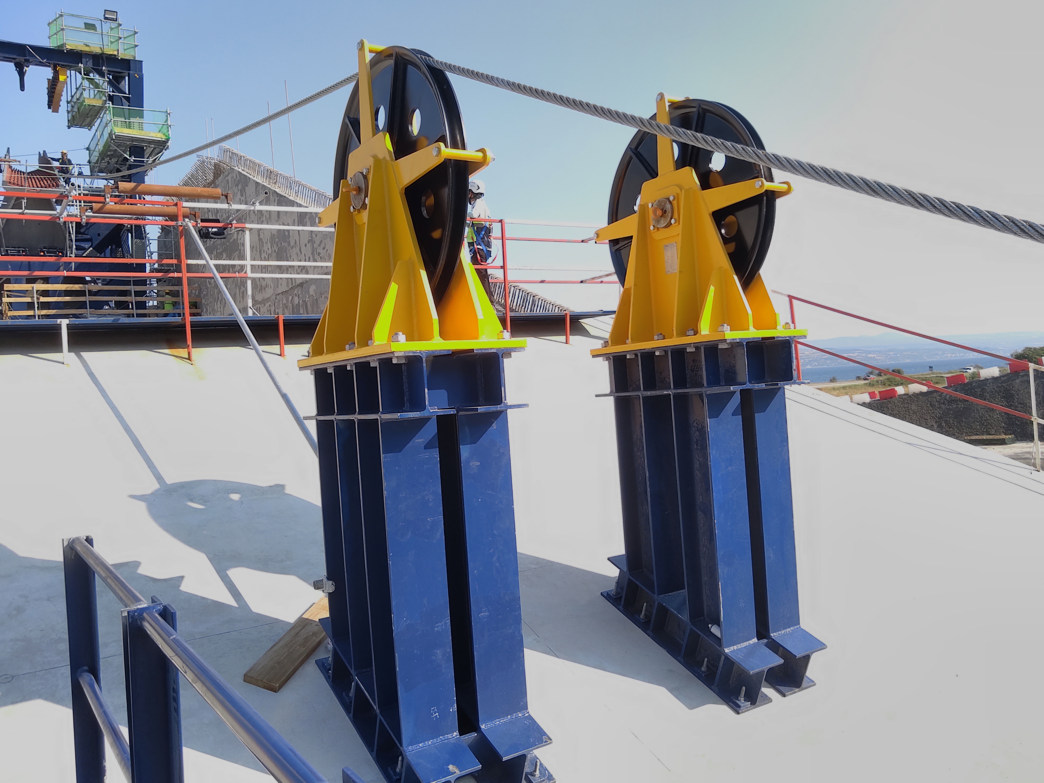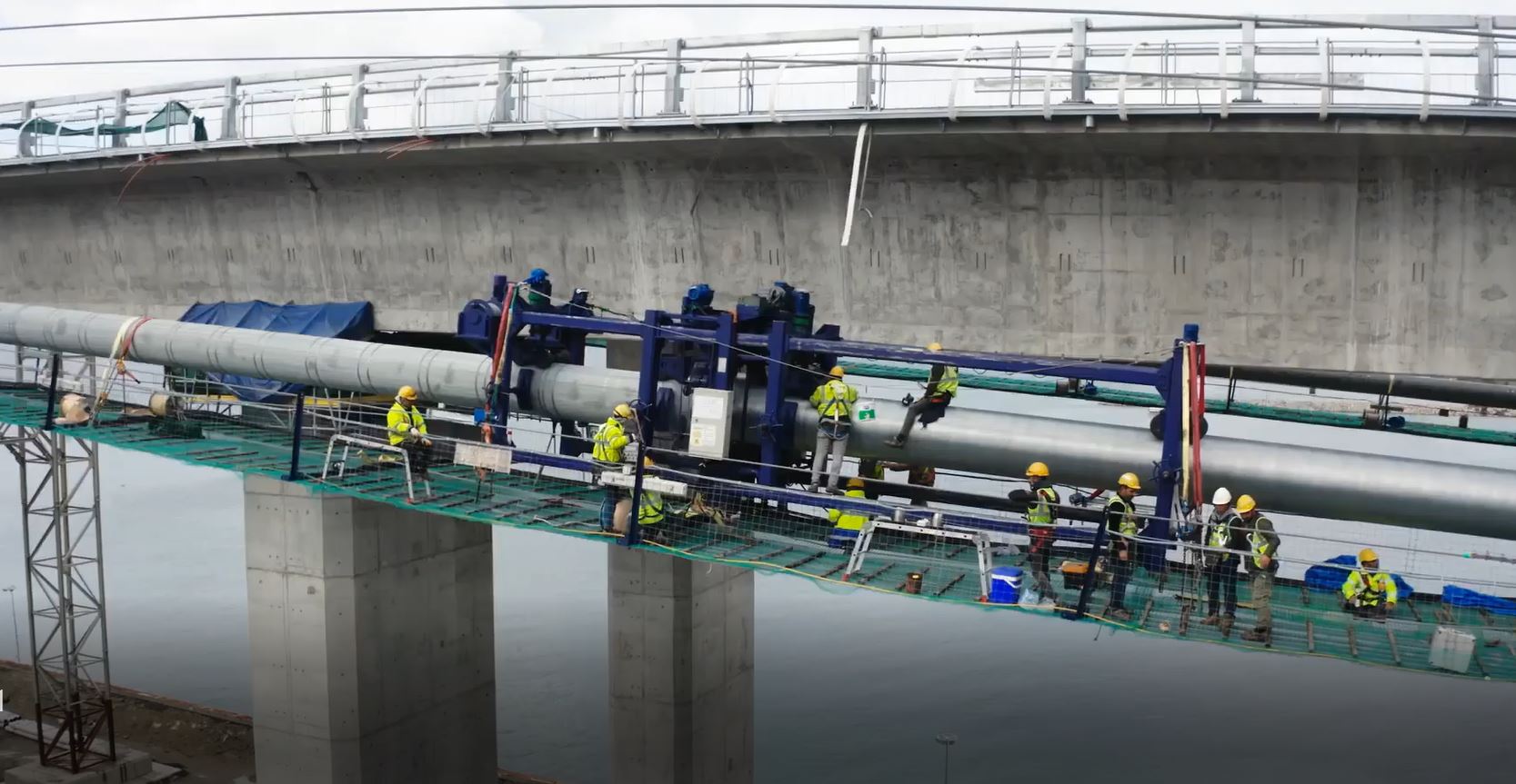 Временный переход и основные кабели PPWS были установлены с помощью монтажной лебедки, поставляемой компанией DLT Engineering. Система состоит из двух закольцованных монтажных тросов, по одному для каждого основного троса PPWS, с парой приводных лебедок постоянного натяжения и барабанов для намотки/разматывания троса для каждого монтажного троса. Две приводные лебедки и устройства для намотки/разматывателя троса для каждого зацикленного монтажного троса были расположены рядом с основными креплениями троса, как показано на видео ниже. Монтажный трос поддерживался по всей его длине с помощью роликов каркаса виселицы над временной дорожкой и рам роликовых колес над верхними седлами пирса и над откидными седлами.