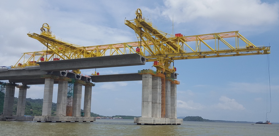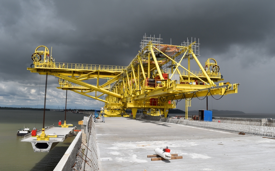 Этот новый тип порталов обеспечивает быстрое и экономичное решение для возведения двухскатных морских виадуков и устраняет необходимость в доставке через палубу с передаточного портала или с литейной площадки в конце моста. Таким образом, литейный цех может быть расположен в любой точке региона с выходом к воде, а виадук может быть построен отдельными секциями без необходимости создания непрерывной линии для доставки через палубу.