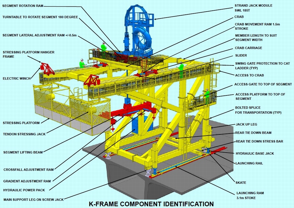 Разница между K-образной рамой и порталом THB заключается в том, что K-образная рама обладает дополнительной способностью переносить сегменты с одного места на другое, когда сегменты не могут быть доставлены непосредственно к конечному месту монтажа.