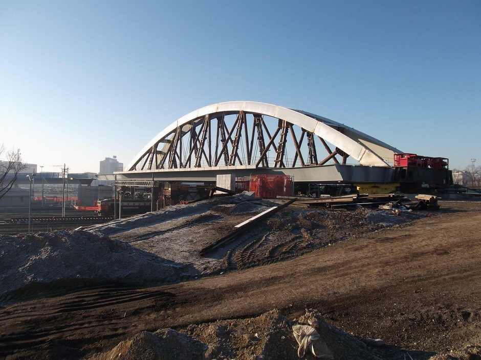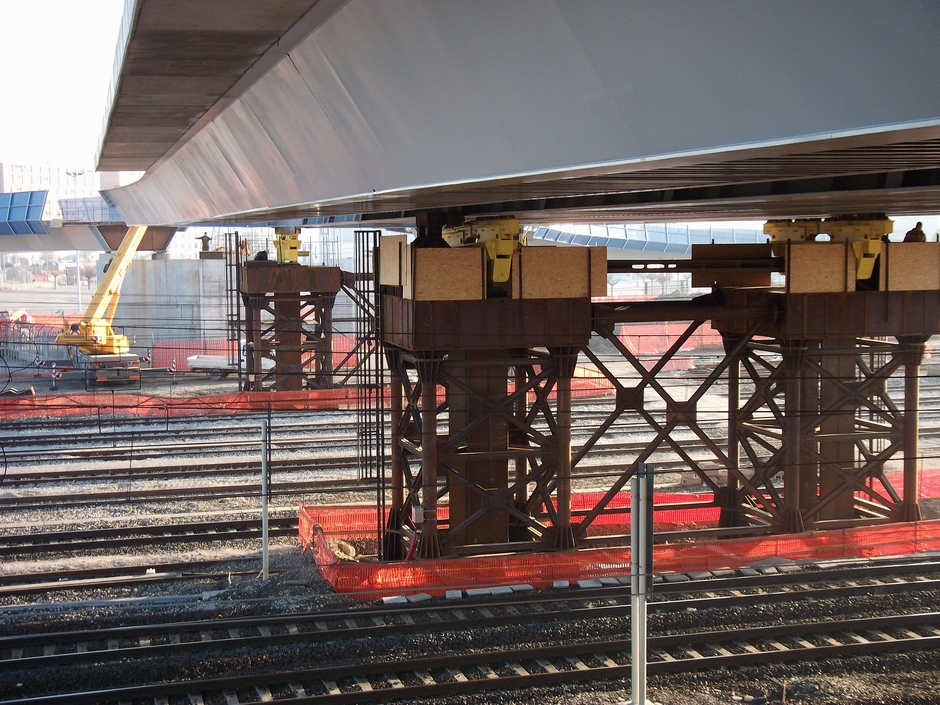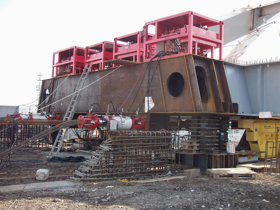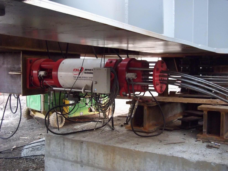 В начале 2011 года 1000-тонное пролетное строение стального арочного моста Понте-Верде в Падуе, Италия, было введено в эксплуатацию компанией Edimo Metallo S.p.A с использованием домкратов Dorman Long DL-S185 и при содействии наших служб проектирования и надзора за строительством. Готовый арочный мост был полностью собран на месте и затем запущен по 90-метровому пролету в конечное положение, пересекая 10 железнодорожных линий No, которые оставались открытыми на всем протяжении. В пределах 90-метрового пролета было 2 временные опоры No для запуска, расположенные между железнодорожными линиями. 2 Домкрата для натяжения нитей DL-S185 не использовались для вытягивания, и еще 2 домкрата для натяжения нитей DL-S185 не использовались для удержания моста от съезда вниз по небольшому склону и для обеспечения возможности обратного спуска в аварийной ситуации.