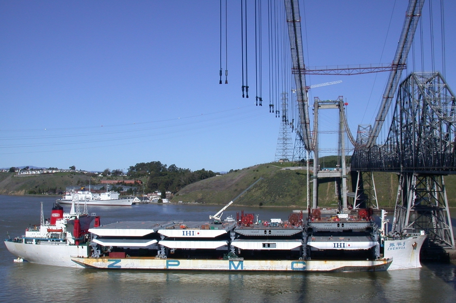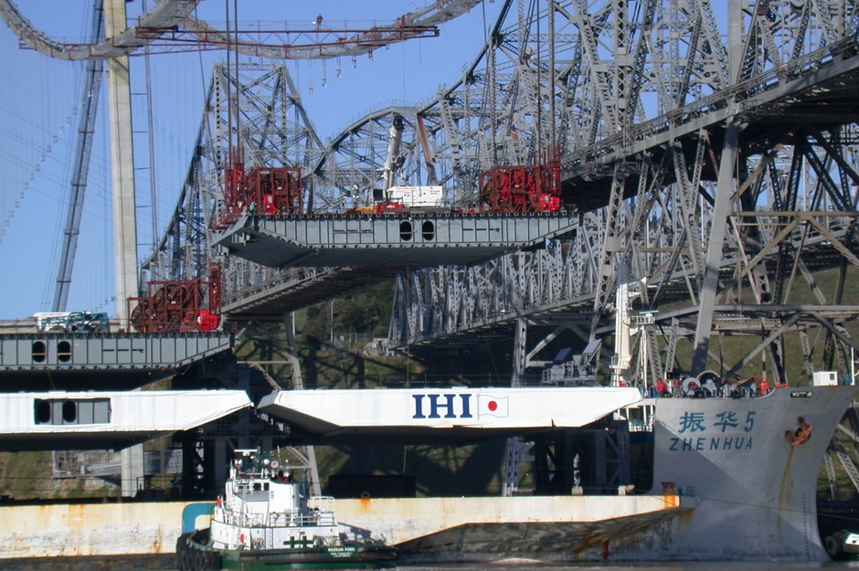 Палубные блоки были изготовлены в Японии и доставлены на место на специально переоборудованных судах, по 8 палубных блоков на партию. Корабли смогли добраться до места установки моста и были пришвартованы под основными тросами для подъема палубных блоков в конечное положение.