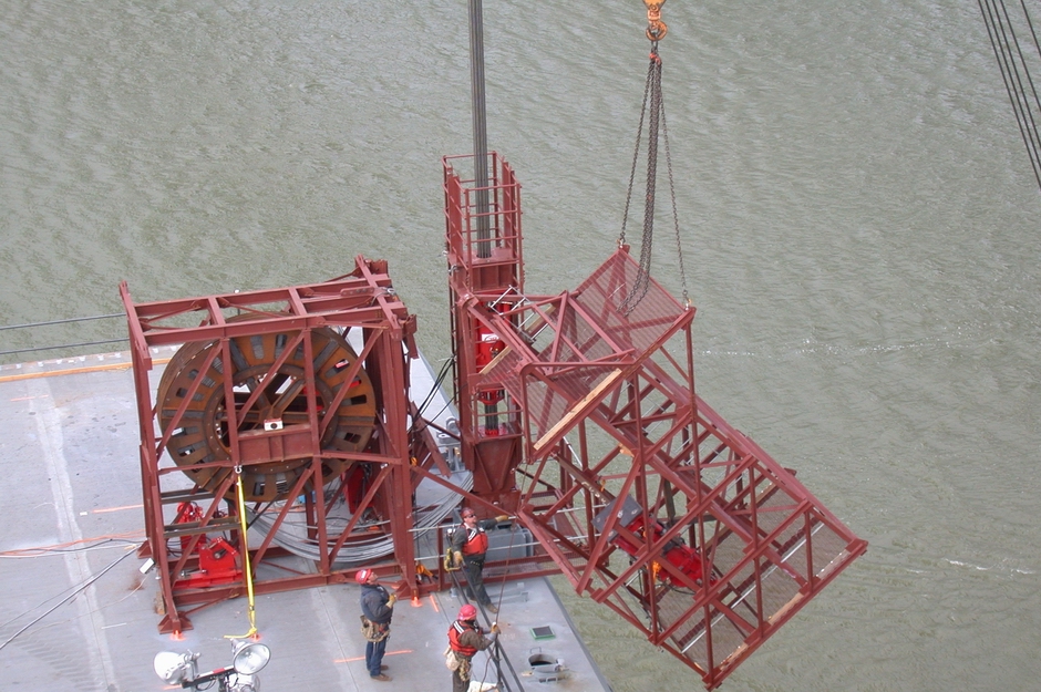 Около половины палубных блоков не могли быть доставлены судами непосредственно под их конечное положение из-за препятствий на уровне воды, и их приходилось поднимать с судна, а затем поворачивать вбок, что часто требовало множества последовательных операций раскачивания. Палубный блок, показанный слева, был поднят на 50 м в конечное положение с помощью двух комплектов домкратов по 4 нити, установленных на рамах, прикрепленных к палубе для обеспечения возможности вращения.