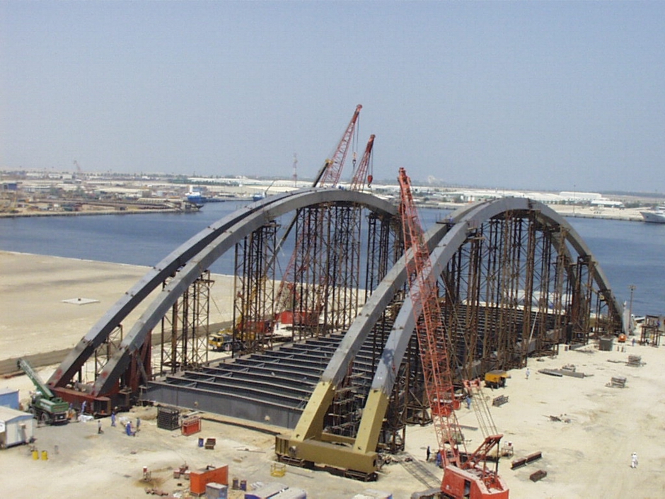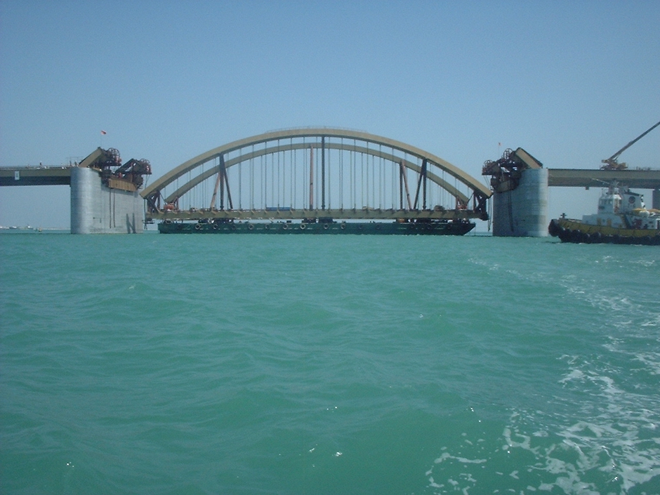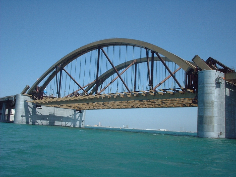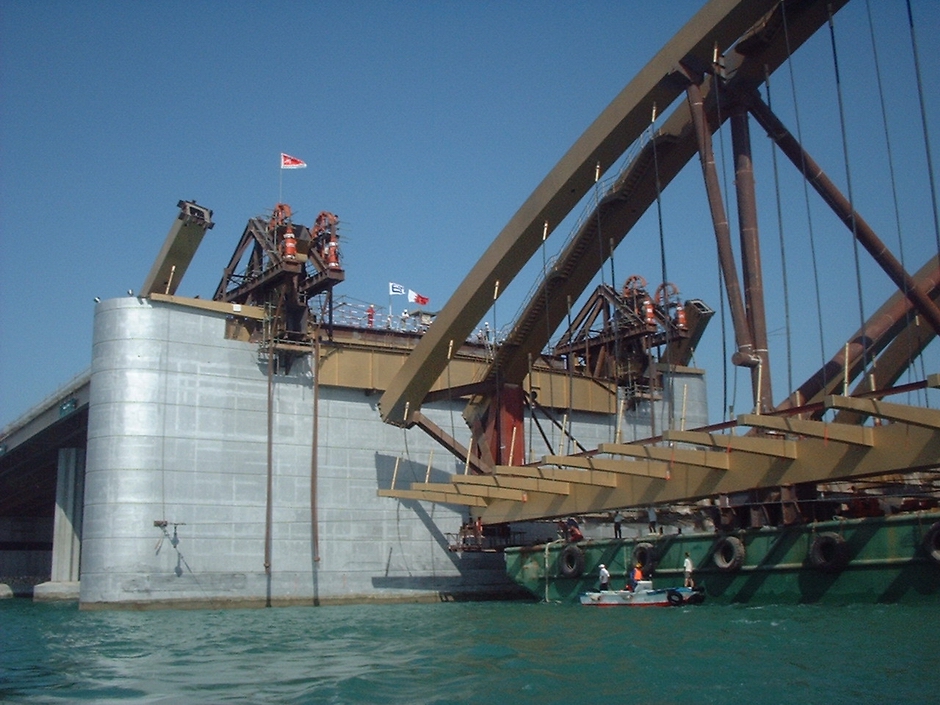 Основной пролет дамбы представляет собой двойную стальную арочную конструкцию протяженностью 121 м и весом более 3000 тонн. Компания Cleveland Bridge, производитель стали и монтажник, наняла компанию DLT для выполнения всех инженерных работ по монтажу для этого проекта. Главный пролет был полностью собран на верфи примерно в 300 милях от места строительства, а затем перевезен баржей в окончательное плановое положение между пирсами. Затем весь настил был поднят на конечную высоту с помощью 8 домкратов грузоподъемностью не более 500 тонн и подсоединен в воздухе к предварительно собранным концевым секциям.